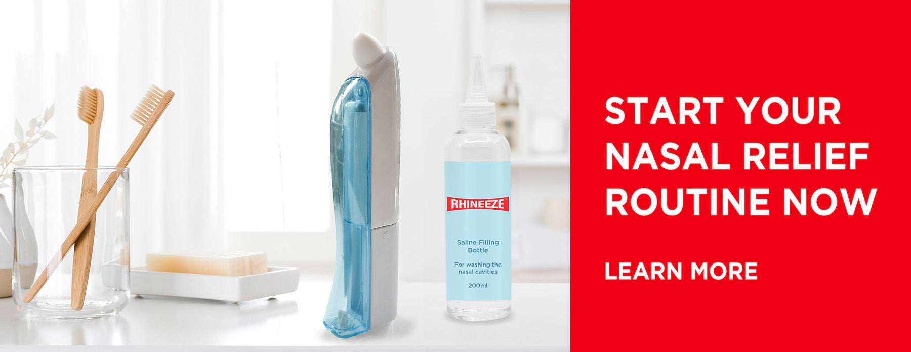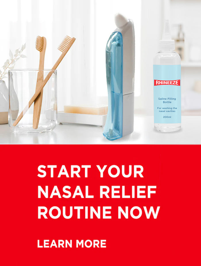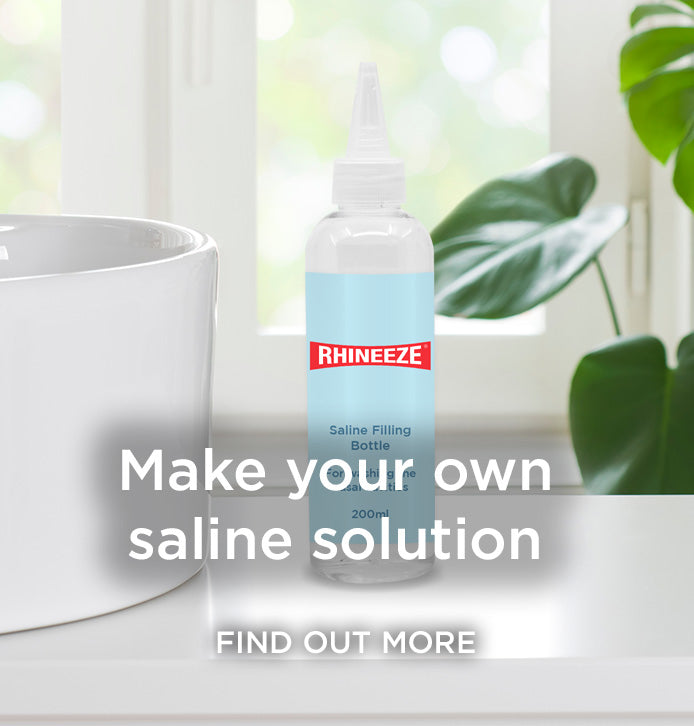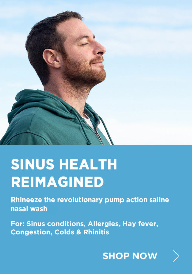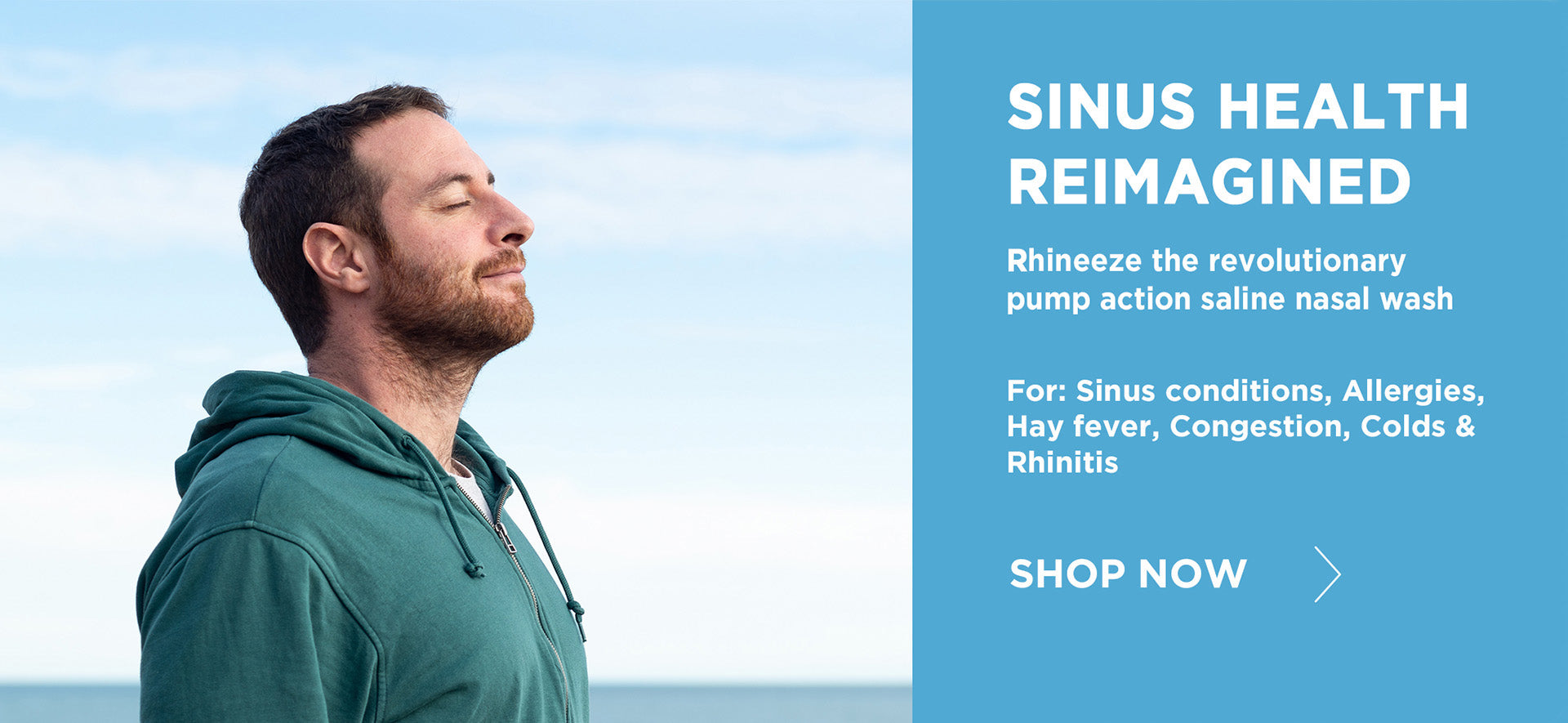 Saline nasal irrigator for washing the nasal cavities to treat sinus related conditions, hay fever and other allergies. Rhineeze has been designed with comfort and simplicity in mind making it as quick and easy to use as brushing your teeth on a daily basis.